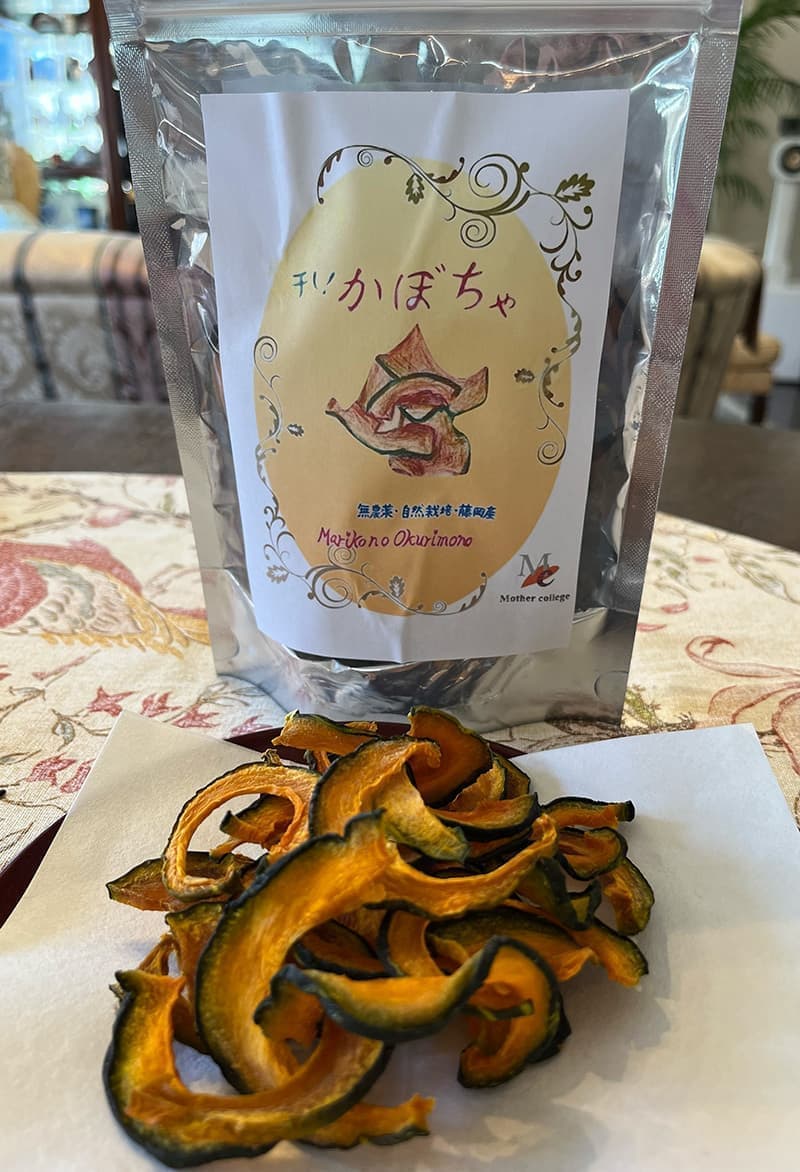 三河高原、尾張丘陵、豊田台地の山々に囲まれた藤岡の地で自然の力に育てられた無農薬栽培のかぼちゃを、スライスして干しかぼちゃにしました。ほくほくしたかぼちゃの甘みがよりいっそう増しました。