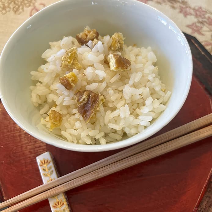 白米をといで、そこに勝栗を直接入れて、ほんの少々の塩を入れ、炊飯器で炊くだけです。